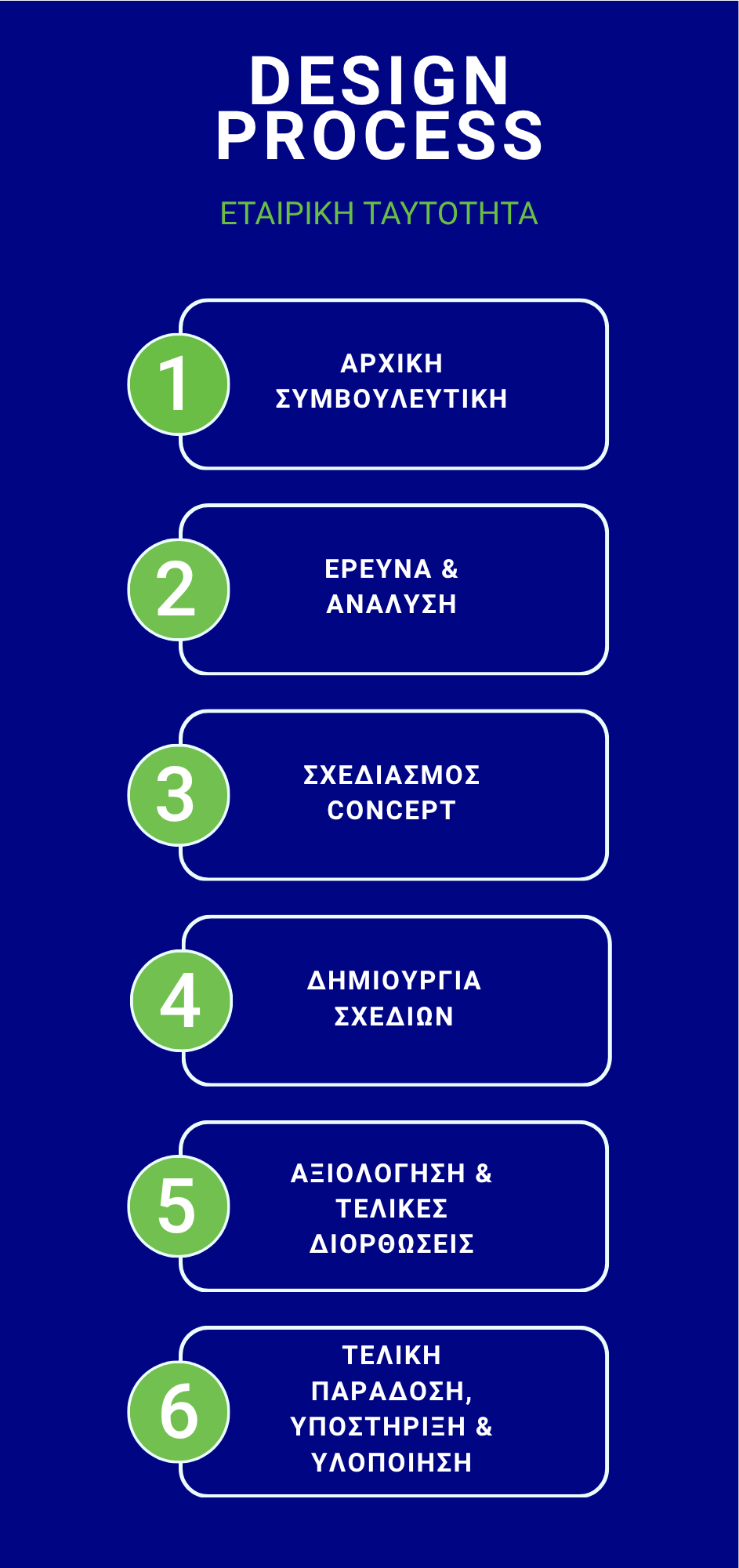 Η εταιρική ταυτότητα είναι το σύνολο των οπτικών και λεκτικών στοιχείων (λογότυπο, χρώματα, γραμματοσειρές, ύφος επικοινωνίας, μηνύματα) που εκφράζουν την προσωπικότητα, τις αξίες και το όραμα της επιχείρησής σας. Μια ισχυρή ταυτότητα βοηθά το brand σας να ξεχωρίζει, να χτίζει εμπιστοσύνη και να γίνεται αναγνωρίσιμο και συνεπές σε όλα τα σημεία επαφής.