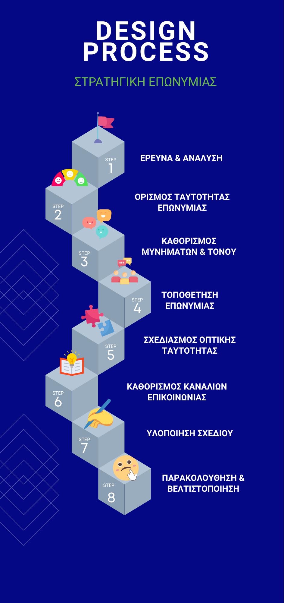 Η δημιουργία και η εφαρμογή μιας στρατηγικής επωνυμίας είναι μια συστηματική διαδικασία που περιλαμβάνει ορισμένα βασικά στάδια. Αναλυτικά: